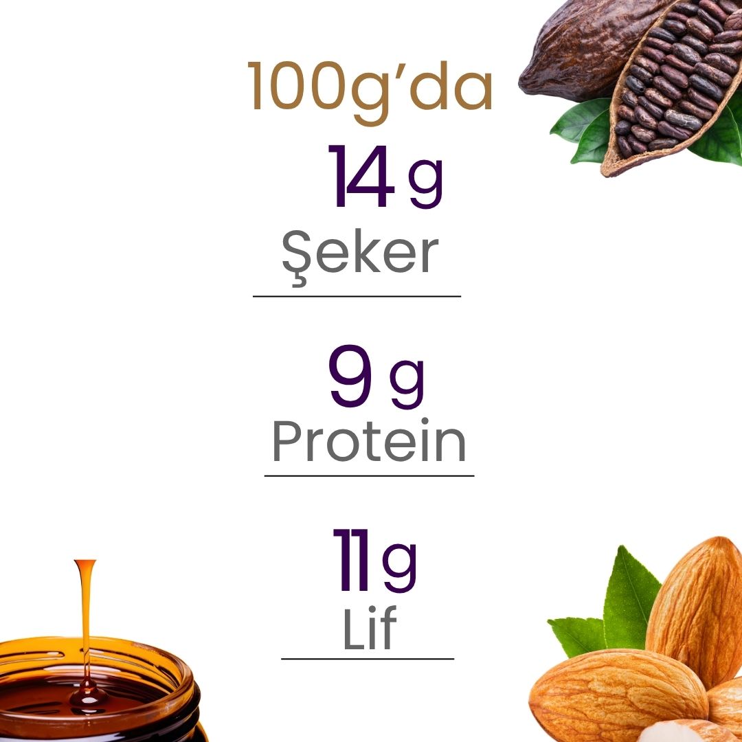 İÇİNDEKİLER: BADEM(%26), KETEN TOHUMU, GLUTENSİZ YULAF EZMESİ, ELMA KONSANTRESİ,FINDIKYAĞI, RENDELENMİŞ HİNDİSTAN CEVİZİ, ÜZÜM PEKMEZİ, KAKAO TOZU (%7), TUZ, TATLANDIRICI (İZOMALT(E953)%6), KABARTMA TOZU, BİBERİYE EKSTRATI, EMÜLGATÖR (AYÇİÇEK LESİTİNİ).ALERJEN UYARISI: BADEMVEFINDIKİÇERİR. ESER MİKTARDAKAJU, SOYA, SUSAM, SÜT TOZU, YER FISTIĞI,ANTEP FISTIĞIVECEVİZİÇEREBİLİR.KULLANIM TALİMATI:ATIŞTIRMALIK OLARAK TÜKETİLEBİLİR.TAVSİYE EDİLEN TÜKETİM TARİHİ (TETT) VE LOT NUMARASI AMBALAJ ÜZERİNDE BULUNMAKTADIR. ESER MİKTARDA CEVİZ VE MEYVE KABUKLARI VE/VEYA TOHUM VE SAP İÇEREBİLİR.MENŞEİ:YERLİ VE İTHAL HAMMADDELER KULLANILARAK TÜRKİYE'DE ÜRETİLMEKTEDİR.MUHAFAZA KOŞULLARI:KURU VE SERİN BİR YERDE SAKLAYINIZ. AÇILDIKTAN SONRA 3 GÜN IÇINDE TÜKETILMESI VE AMBALAJININ KAPALI OLARAK SERIN YERDE SAKLANMASI TAVSIYE EDILIR. DOMUZ YAĞI VE KATKILARI IÇERMEZ.