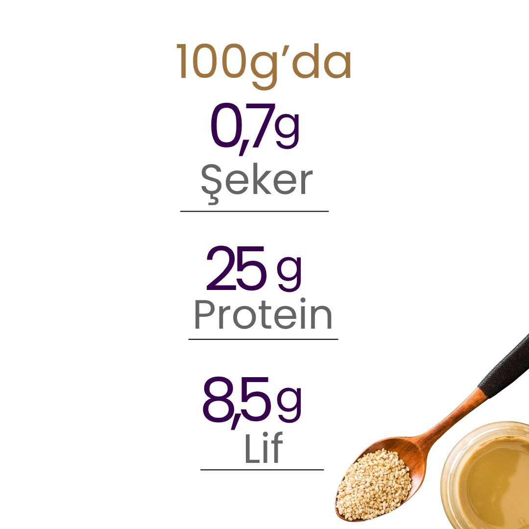 İçindekiler: %100 Susam. Alerjen Uyarısı: Susam İçerir. Esen Miktarda Kaju, Soya, Fındık, Badem, Süt Tozu, Yer Fıstığı, Antep Fıstığı Ve Ceviz İçerebilir. Kullanım Talimatı: Kahvaltılarda ve Atıştırmalık Olarak Tüketilebilir. Menşe: Yerli ve İthal Hammaddeler Kullanılarak Türkiye’de Üretilmektedir. Tavsiye Edilen Tüketim Tarihi (TETT) ve Lot Numarası (LOT) Ambalaj Üzerinde Bulunmaktadır. Muhafaza Koşulları: Buzdolabı Dışında, Kuru ve Serin Yerde Saklayınız. Açıldıktan Sonra Ambalajın Kapatılarak Serin Yerde Tutulması Tavsiye Edilir. Domuz Yağı ve Katkıları Yoktur. Ürünümüzde faz (yağ) ayrılması bozulma belirtisi değildir. Kullanmadan önce karıştırınız.